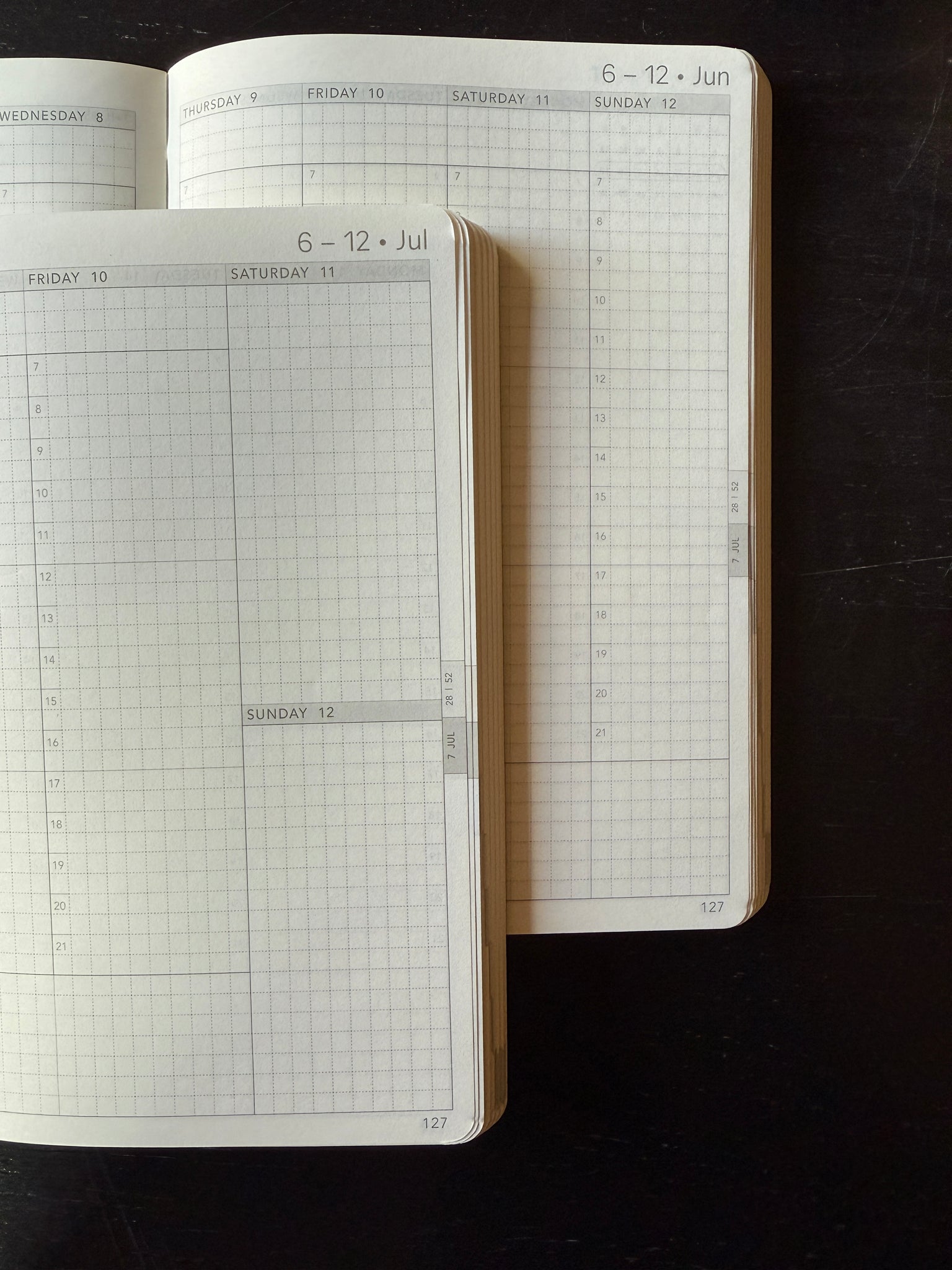 Page 127 reads “6–12 • Jun” instead of “6–12 • Jul,” and page 129 reads “13–19 • Jun” instead of “13–19 • Jul.” One letter change from an N to an L. (see last product photos -They show our the stacked version on top with the correct header and the unstacked on the bottom with the error)