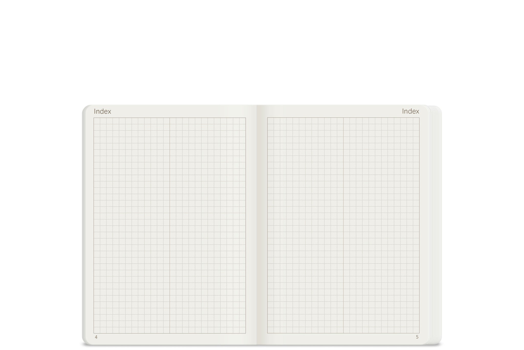 Wonderland 222 A5 planner index spread with minimalist grid layout on white paper, two-page index design for organizing notes, planning, and reference sections.