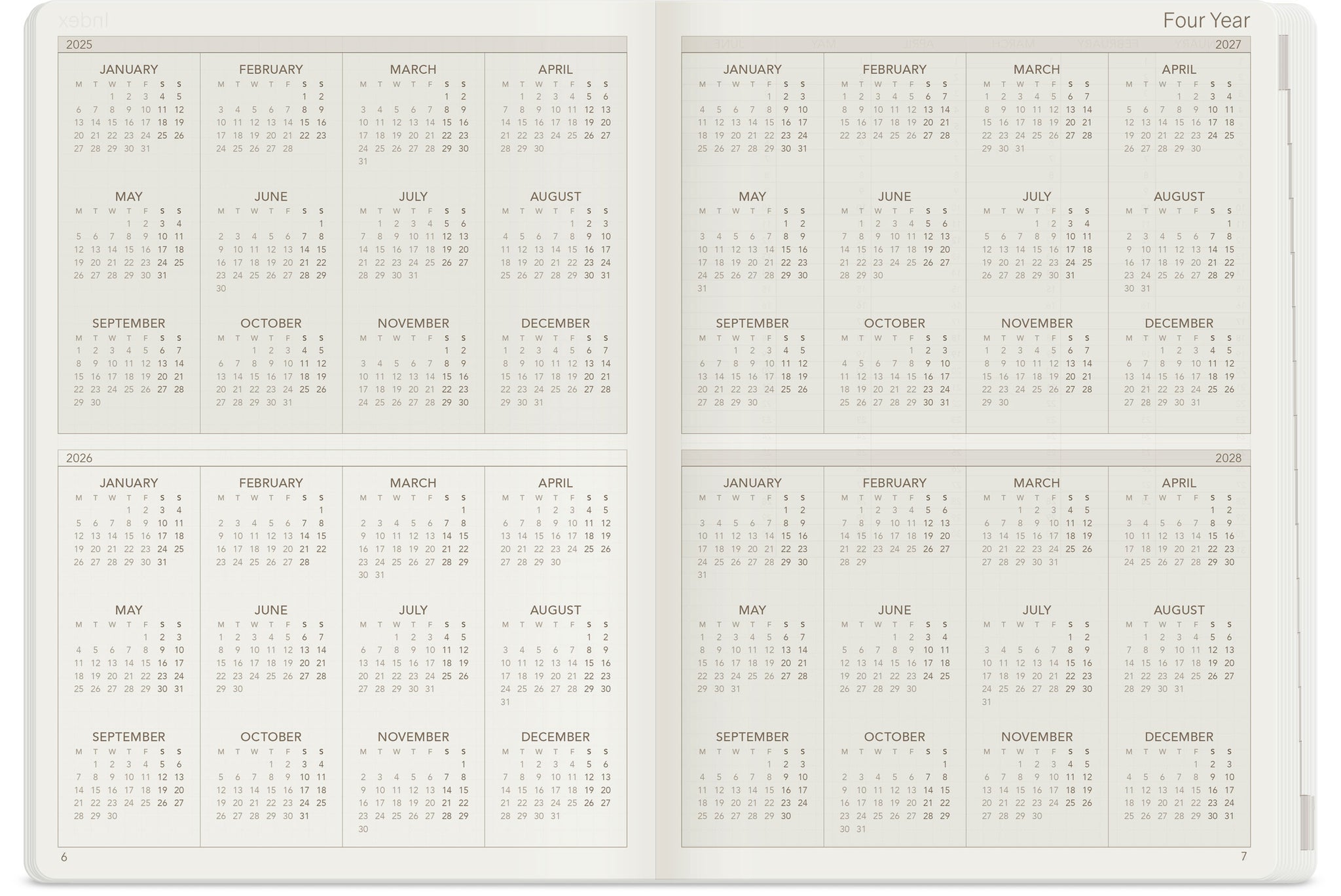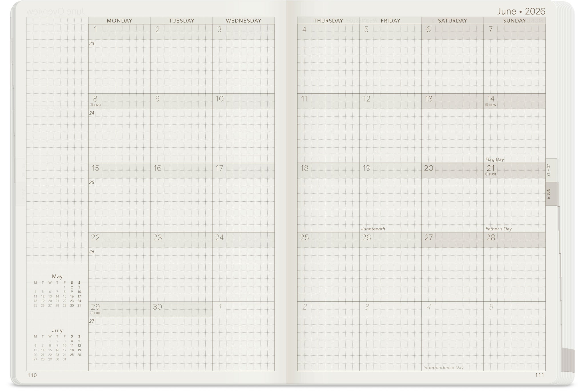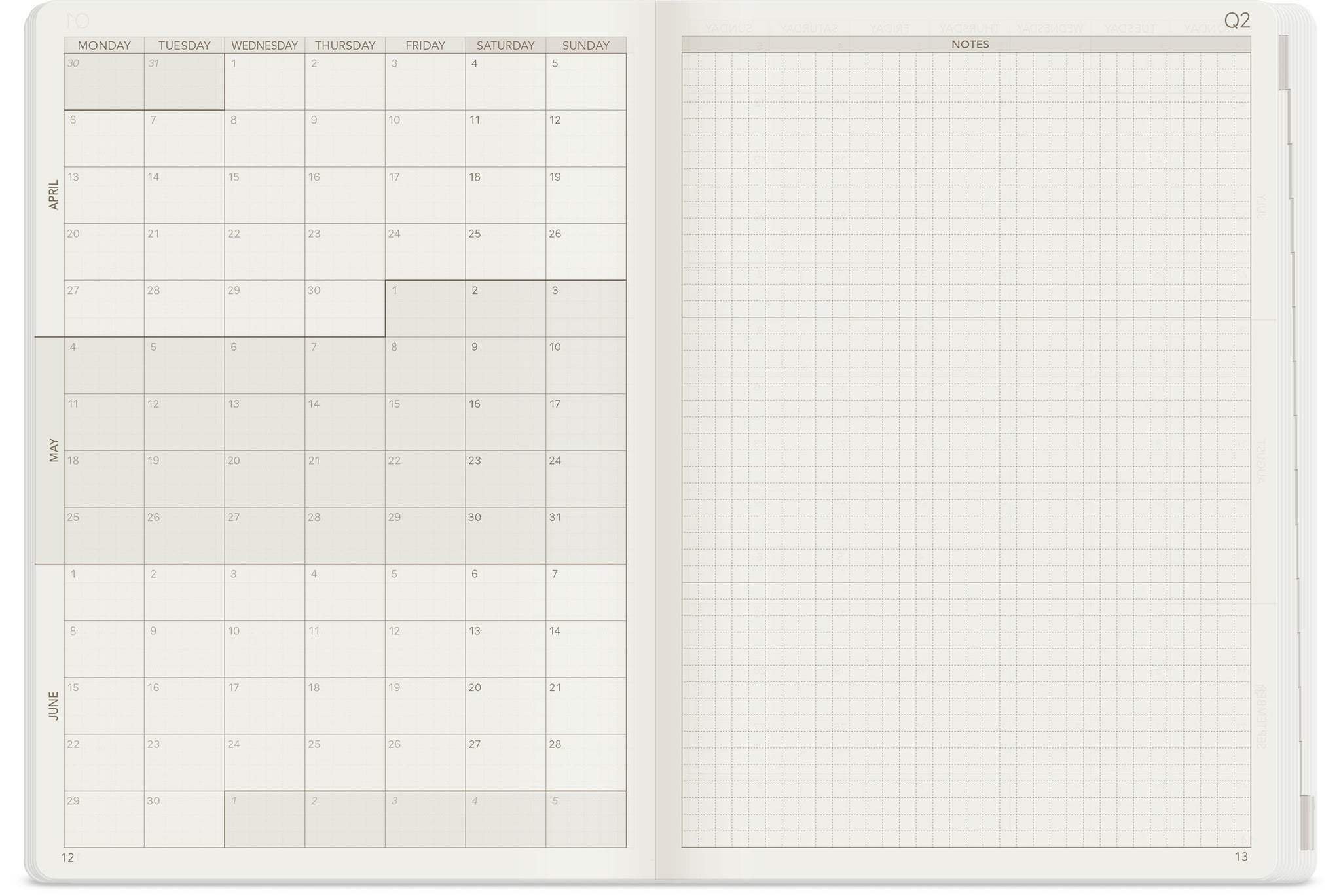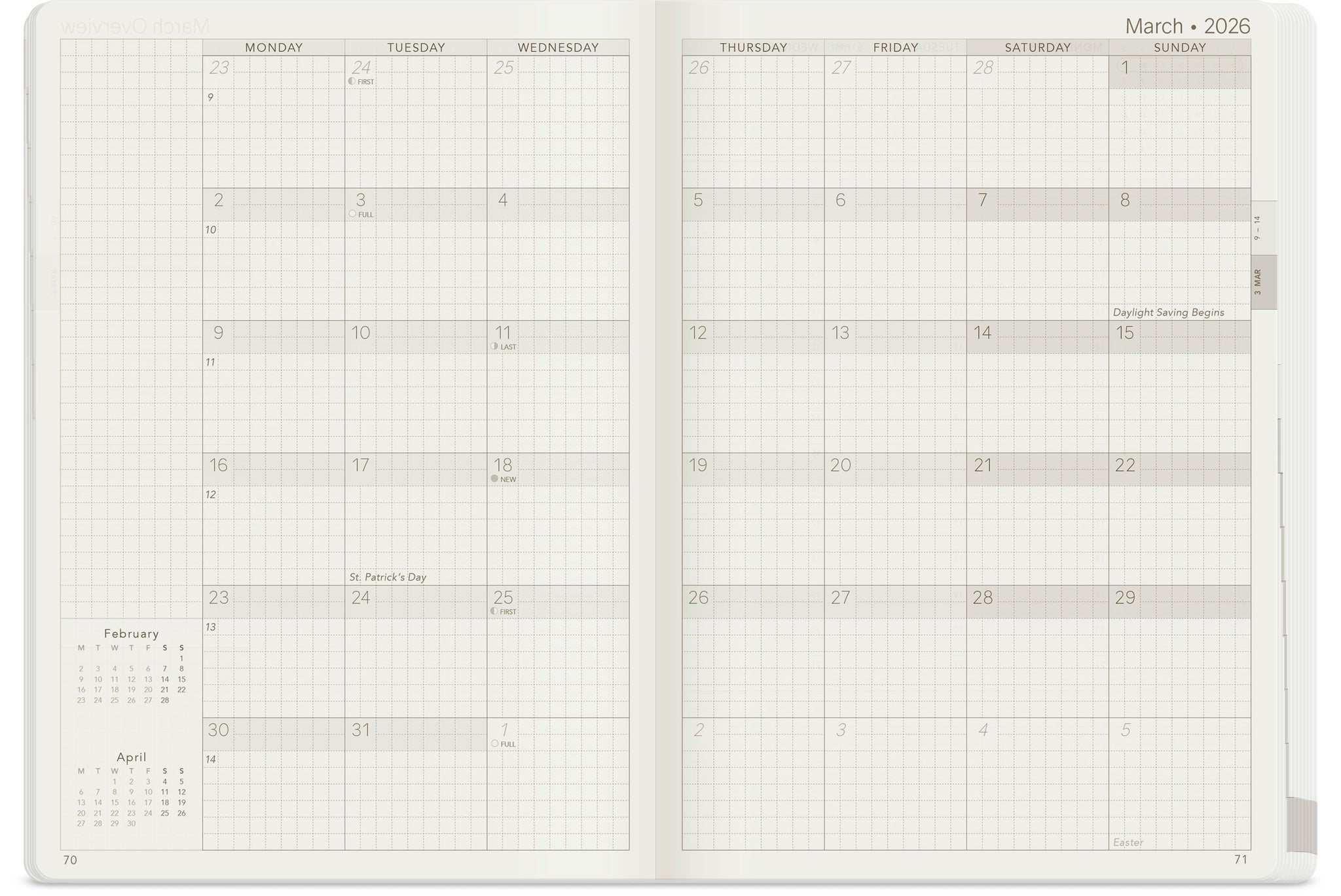 - Monday Start: Weeks start on Monday for consistent weekly planning.