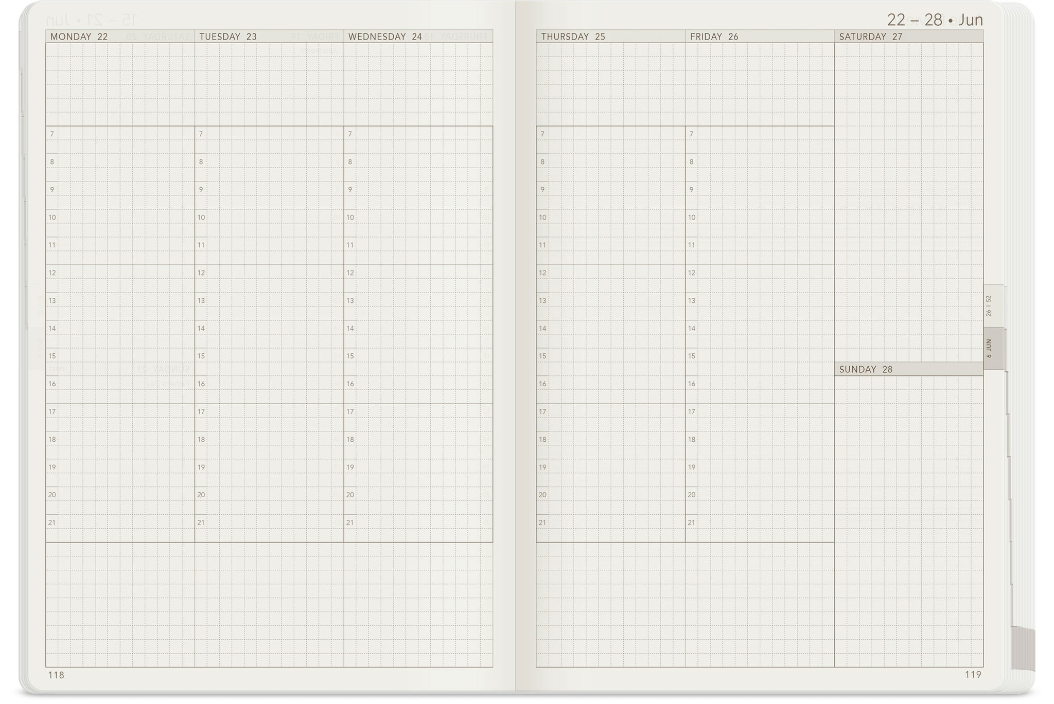 - Stacked Layout: Saturday and Sunday share a column, creating ultra-wide columns for the weekly layout.