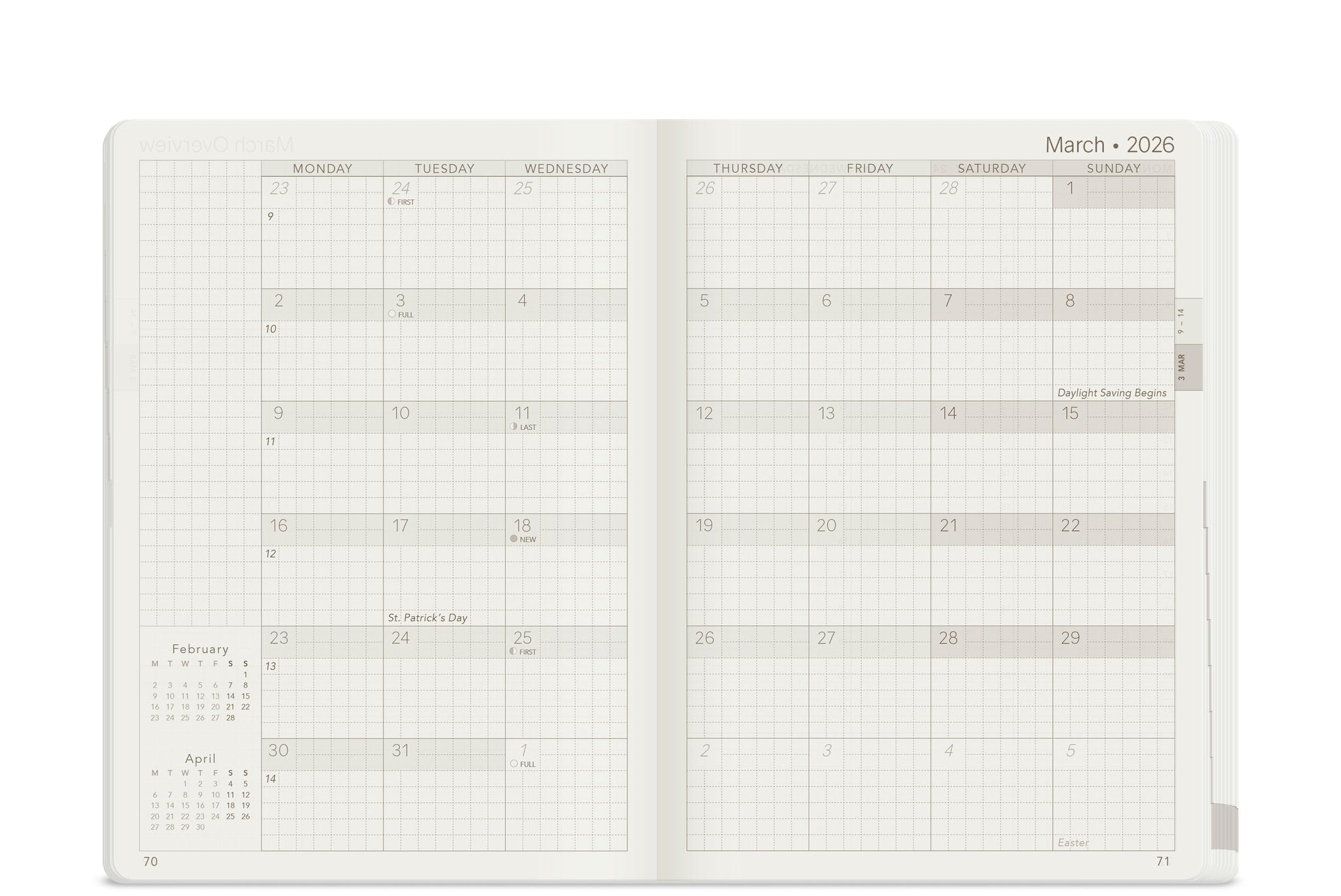 • Monday Start: Weeks start on Monday for consistent weekly planning.